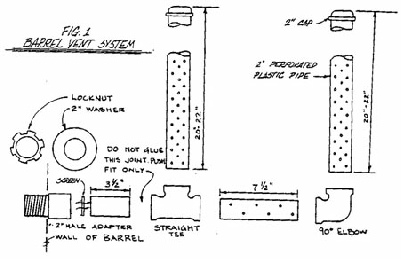 h. Install the vent system by sticking the male adapter thru the hole in the barrel and screwing either the female adapter or the lock nut and washer onto the adapter. When using the 2" female adapter, spacing washers may be needed. Use silicone caulk liberally to seal the opening.
