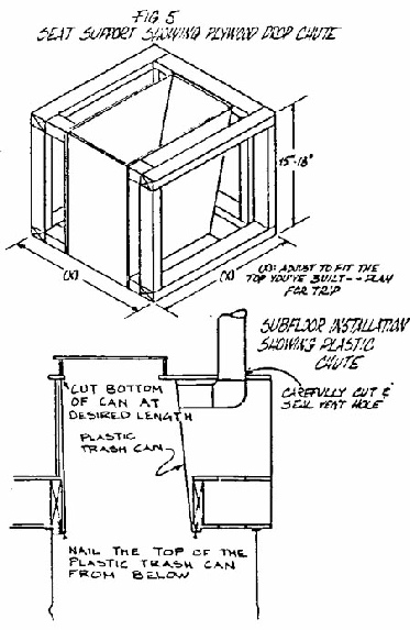3.    Sub-Floor Installation.  This is preferred method for in-house toilets (See Fig. 4). This system allows maximum flexibility in designing the seat unit itself. (No steps needed.) Mounting the barrel below the floor requires about 4' of clearance under the floor in a basement, crawl space or under a porch. One disadvantage is the climbing of any steps required to remove the barrel. If you choose this route you will need a good dolly with straps.