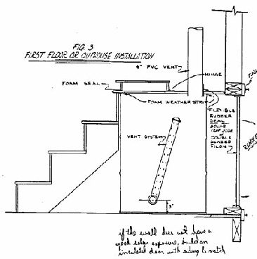2. First Floor Installation. Here the barrel is used inside an enclosure inside the home. the main disadvantage is moving the barrel into and out of the home. The best answer is to build a small solar trap door on the exterior wall of the house (See Fig. 3). A second alternative is to move the barrel through the house and out an existing door. A wheeled dolly would be very necessary for this installation. Rolling a 300 pound steel barrel on finished floors is NOT recommended. Because each installation is different, the drawing and this discussion are the limits of our coverage of the first floor installation.